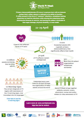 22nd‐29th of April 2014 – For the fourth consecutive year, the primary immunodeficiencies (PI) community joins forces to celebrate World Primary Immunodeficiency Week (WPIW). On this occasion patients, healthcare professionals, and the general public gather together for seven days to call for increased awareness of this devastating condition and mobilize to take it out of the shadow through concerted global action.